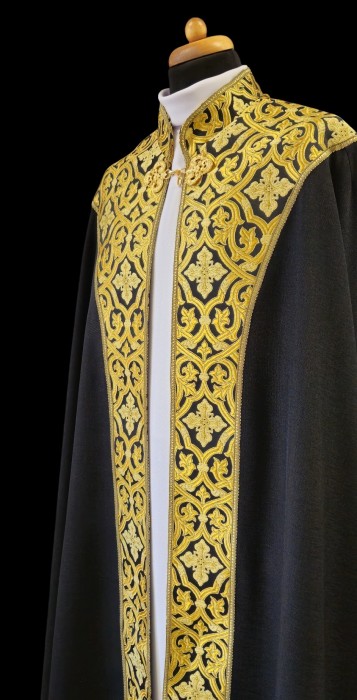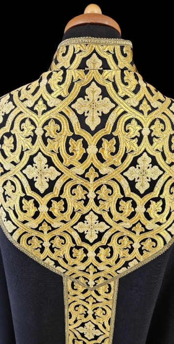 Pluviál je ušitý z ozdobnej tkaniny damaškového typu – zdobený zlato čiernym brokátom.